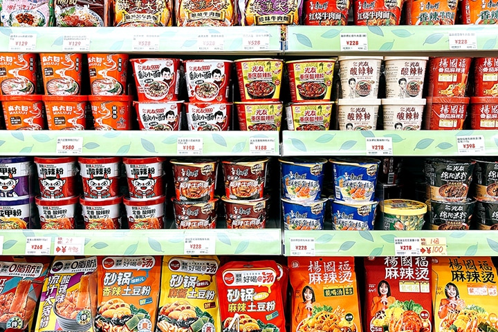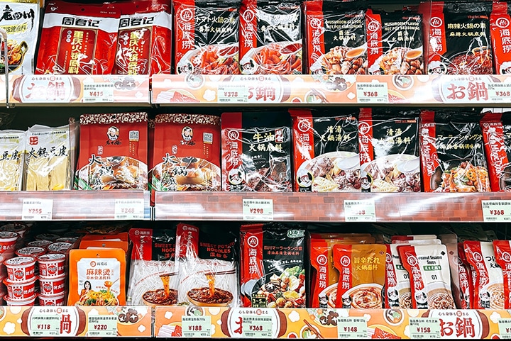 实体店地下1F主要经营常温食材和调味料。中国的皮蛋、龙口粉丝、泰国的冬阴功汤、越南的河粉等亚洲各国具有代表性的食材,品种丰富齐全。另外,普洱茶、铁观音等中国茗茶以及最近大热的粉丝、火锅底料等麻辣燙系列商品也应有尽有。