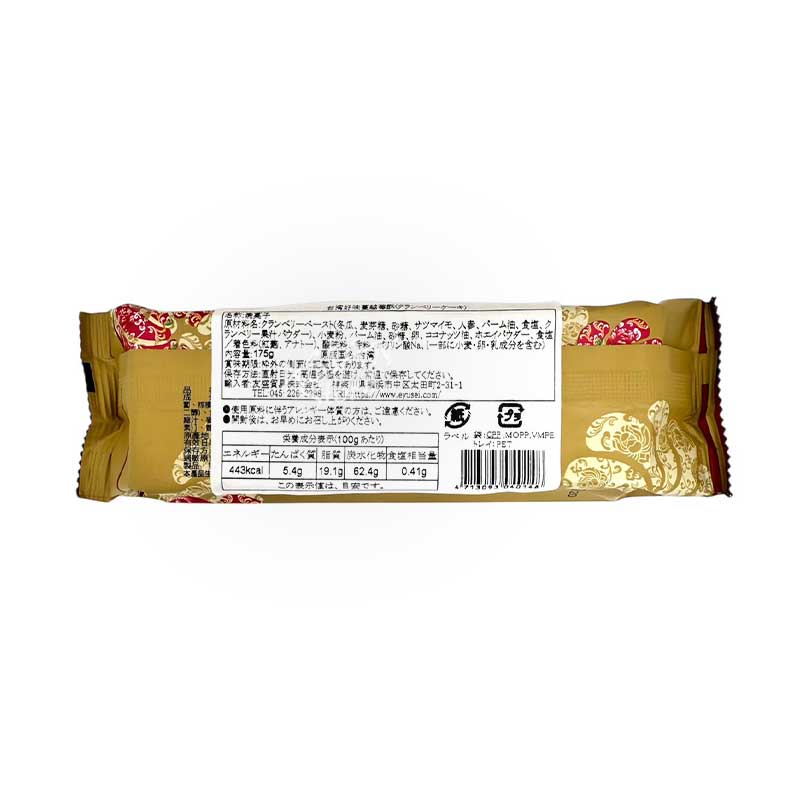 【原材料】クランベリーペースト(冬瓜、麦芽糖、砂糖、サツマイモ、ニンジン、パーム油、食塩、クランベリー果汁パウダー)、小麦粉、パーム油、砂糖、卵、ココナッツ油、ホエイパウダー、食塩/着色料(紅麹、アナトー)、酸味料、香料、ポリリン酸Na(一部に小麦、卵、乳成分を含む)