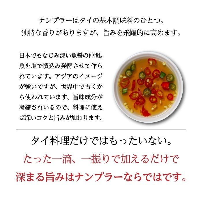 24ヶ月じっくり熟成させ、クリアな上澄みだけを使用しているため、旨みはたっぷりなのにクセの少ないこだわりのナンプラーです。