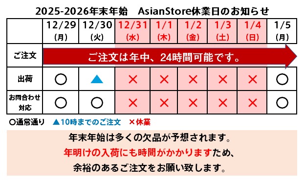 メーカー休業に伴い、2025年12月31日(水)-2025年1月4日(日)の間、出荷を行いません。